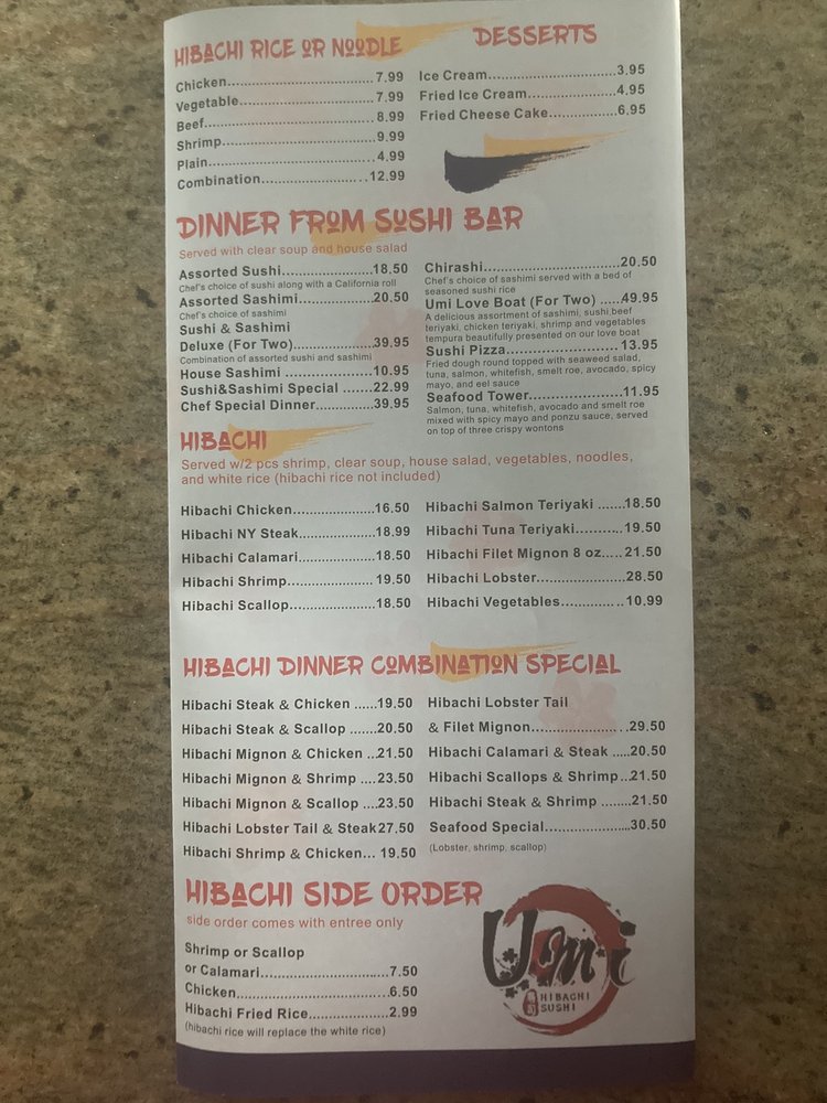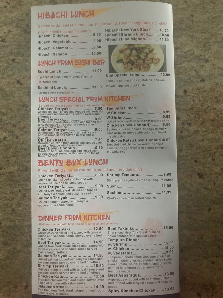 Umi is a Japanese sushi bar located in Chalmette, LA, offering a variety of appetizers, hibachi rice/ noodles, and lunch options. The restaurant provides takeout, delivery, and catering services, with a welcoming casual atmosphere perfect for groups, kids, and casual dining. Their menu includes vegetarian options and a full bar for a diverse dining experience. Customers praise the delicious sushi, hibachi dishes, and appetizers like crab rangoons and agedashi tofu. The service is noted as efficient and accommodating, with many patrons enjoying both dine-in and takeout experiences. Overall, Umi proves to be a favorite spot for families and sushi enthusiasts, offering flavorful dishes at a reasonable price point.